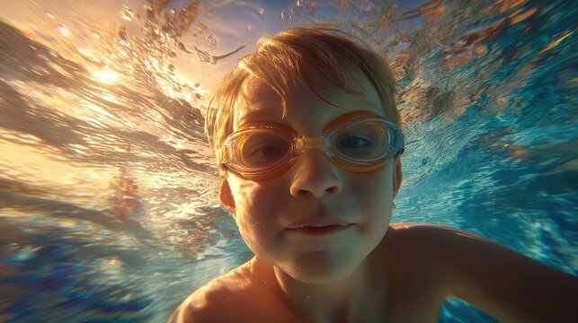 A young boy wearing goggles swims underwater, captured in a close-up shot with sunlight reflecting on the water surface.