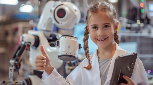 Smiling girl lab coat and glasses holding tablet, engaged science experiment with classmate, showcasing curiosity and learning modern lab