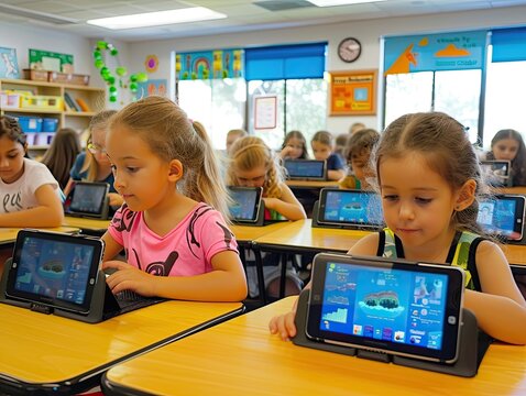 Young students engaging with tablets for interactive learning in a colorful classroom environment.