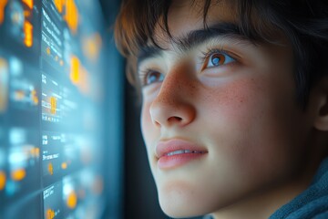 Teenage boy engaging with digital data visualization on a futuristic interface.
