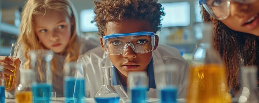 Curious young scientists exploring science experiments in a laboratory setting with colorful liquid-filled beakers and protective goggles