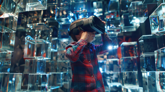 A young boy wearing a virtual reality headset, exploring new worlds in an engaging and immersive experience.
