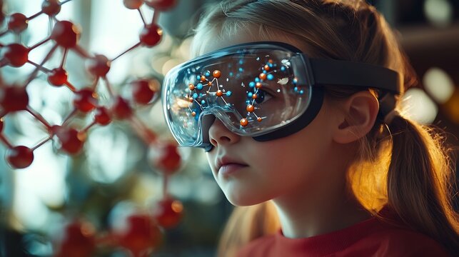 Child Explores Molecular Models with VR Glasses Girl Wearing Reality Headset Interacts with 3D Molecule Immersive STEM Education : Generative AI