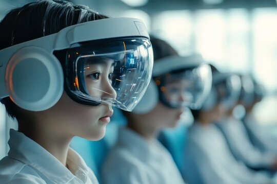 Students participate in a virtual reality learning experience in a modern classroom setting