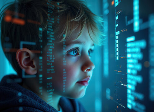 A child's profile overlaid with futuristic digital code, symbolizing the future of technology and its impact on young minds.