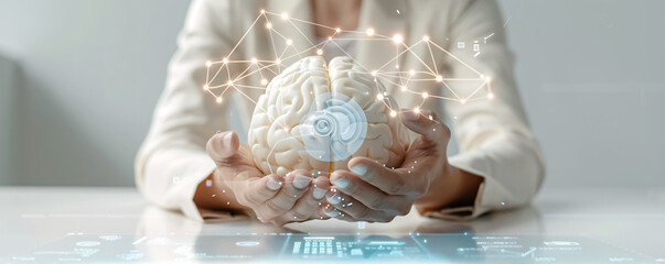 Researcher coding machine learning models with abstract digital elements overlay
