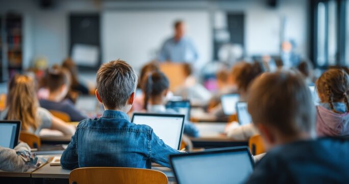 Students focus on laptops in classroom. Many young people wearing headphones use laptops for learning. Modern tech, education in school setting. Diverse students participate in interactive lesson.