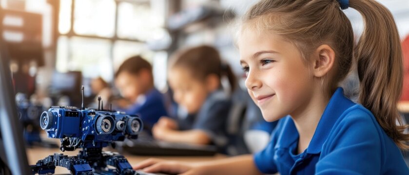 Children playing and learning, Young girl focused on using a laptop in a classroom setting, surrounded by other children engaged in learning activities.