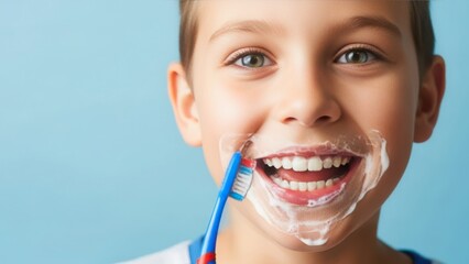 Young boy brushing teeth with toothpaste foam. Happy child practicing oral hygiene. Dental care and healthy habits concept. Copy space