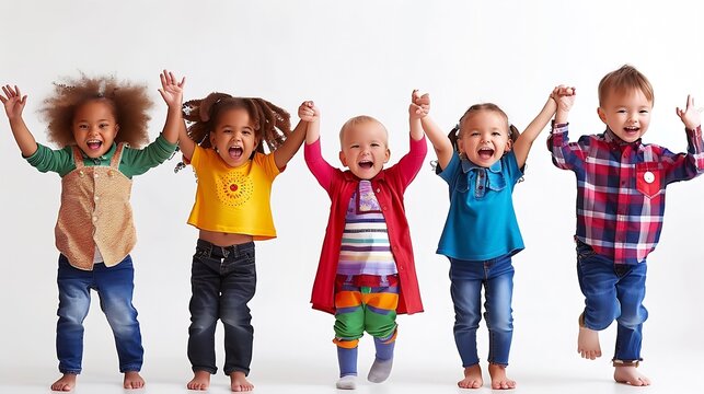 a diverse group of preschool children singing and dancing with a plain white background : Generative AI