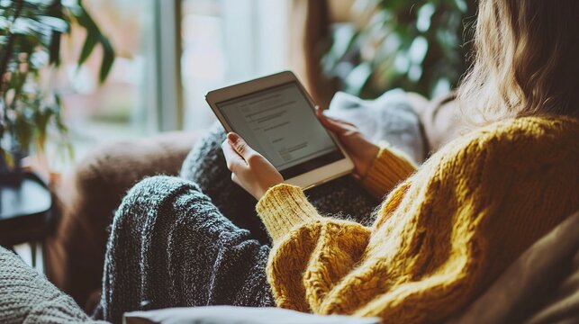 Casual home setting with woman using digital tablet