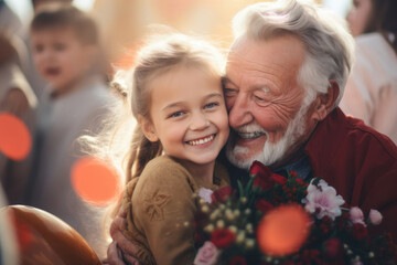 Grandfather hugs his granddaughter with joy and love. Grandparents' Day, Children's Day, Children's Day