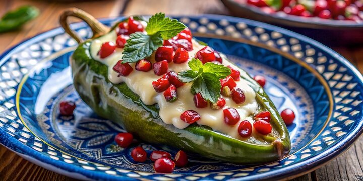 A delicious chile en nogada on a blue patterned plate, a traditional dish