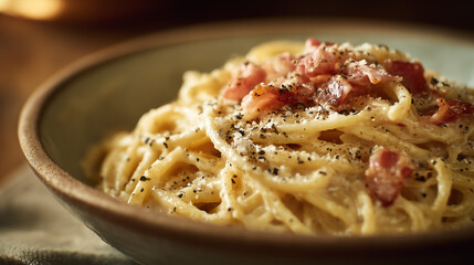 Creamy pasta carbonara with parmesan flakes and black pepper in ceramic bowl, warm golden lighting