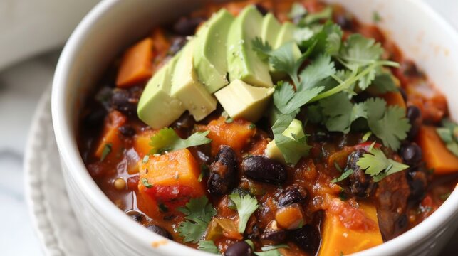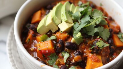 Colorful plant-based bowl featuring halved avocado, sweet potato, onion and waveform overlay