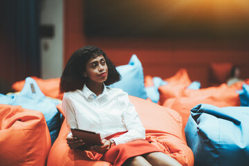 Portrait of a young beautiful African-American businesswoman sitting on an orange cushion with a tablet pc in hands indoors of a modern office chillout coworking area and thoughtfully looking aside