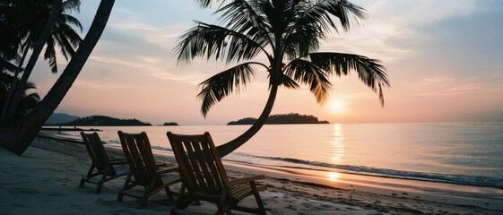 Serene beach scene with silhouetted palm trees and lounge chairs facing the glowing sunset over a calm ocean, evoking tranquility and relaxation.