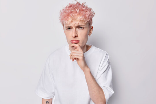 Negative facial expressions concept. Displeased pink haired European man keeps hand on chin frowns face feels discontent dressed in casual t shirt isolated over white background. Studio shot