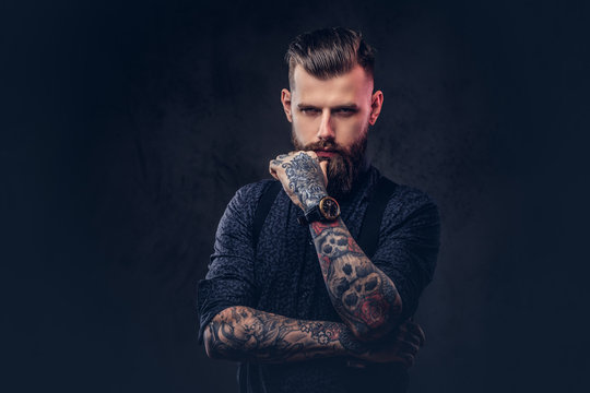 Portrait of manly bald guy with tattoo on his arms looking aside and holding his chin, isolated over gray background
