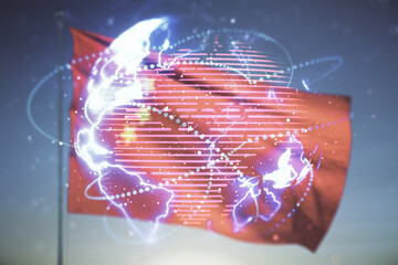 Double exposure of abstract digital world map hologram with connections on Chinese flag and sunset sky background, big data and blockchain concept