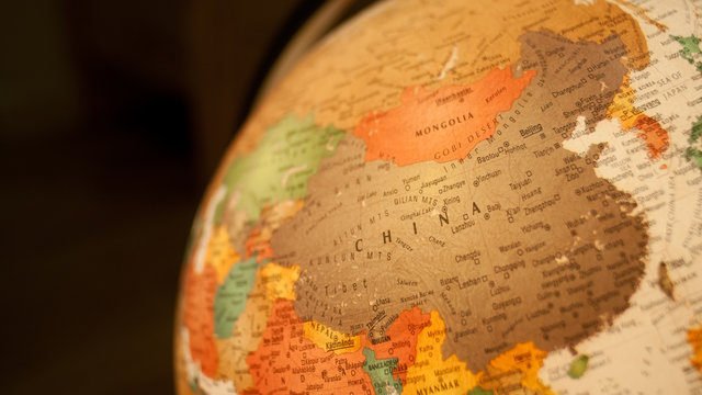 Vintage globe close-up showing china and east asia in soft focus for travel education