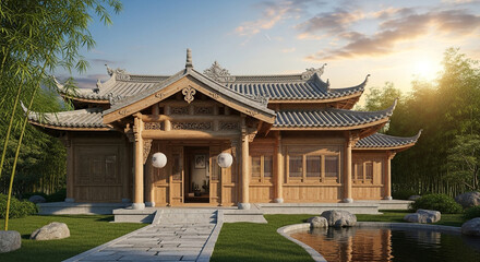 A traditional chinese house with intricate details and a serene garden, a symbol of cultural heritage and architectural beauty under a bright sky