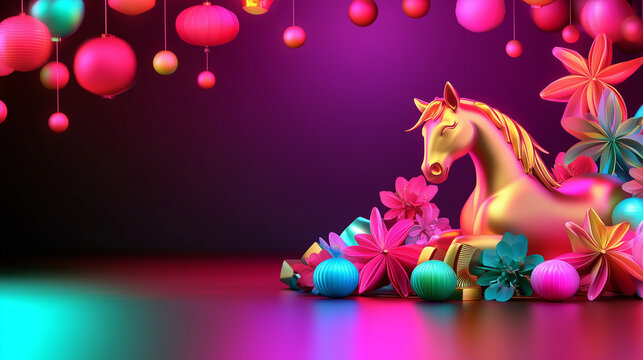 2026 new year with copy space for text, a dynamic pose against a vibrant red background. The horse is adorned with intricate golden patterns. luxury red and gold chinese horse new year background,