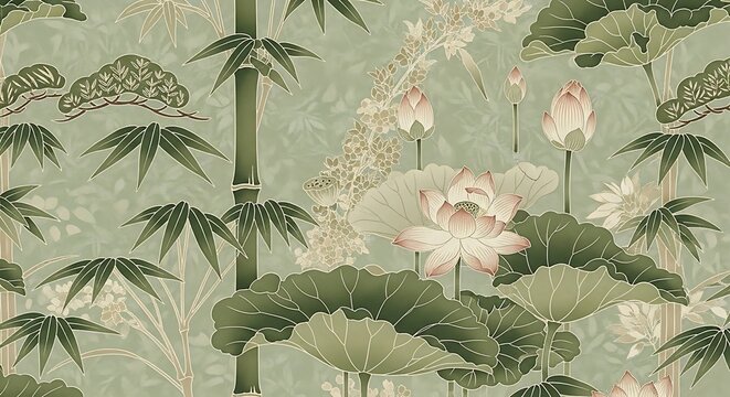 Seamless pattern with bamboo, lotus flowers, leaves, and pine branches background design evokes