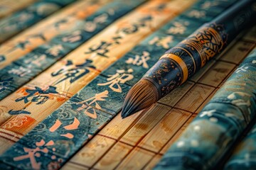 Ancient Chinese scroll with calligraphy on a bamboo mat, featuring elegant brush strokes and traditional characters, evoking a sense of history and cultural heritage.