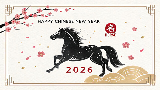A black horse gallops amidst cherry blossoms and golden clouds, framed by traditional chinese design elements, celebrating the chinese new year 2026