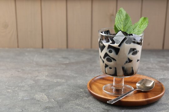 Paper bowl with tasty Chinese noodles and meat on dark wooden background with space for text