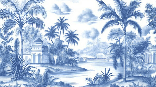 Tropical landscape painting showing buildings, palm trees and lake in monochromatic blue