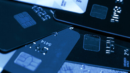Macro detail of a brand new black and gray luxurious credit card, concept EMV chip card is a technical standard for smart payment cards , One of the digital banking, It gives the customer.