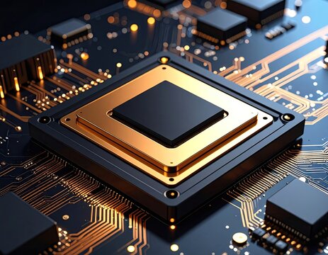 A close up view of microchip on circuit board, showcasing intricate details and glowing connections