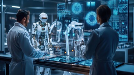 Technicians overseeing AI chip fabrication in a futuristic facility filled with robotic arms and digital screens