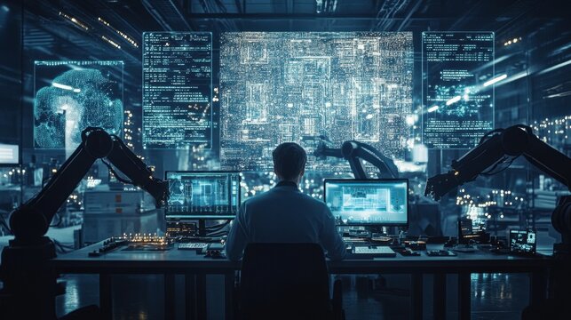 Advanced Robotic Arms on a Symmetrical Assembly Line in a Sterile Semiconductor Fab.