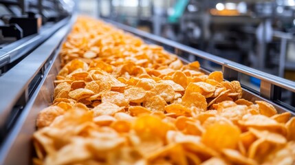 Conveyor line for the production of potato chips. The worker performs quality control to produce tasty chips.