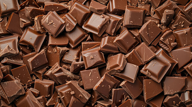 Texture of broken chocolate. Chocolate background. A bar of dark or milk chocolate is broken into pieces. Sweet food, dessert, cocoa