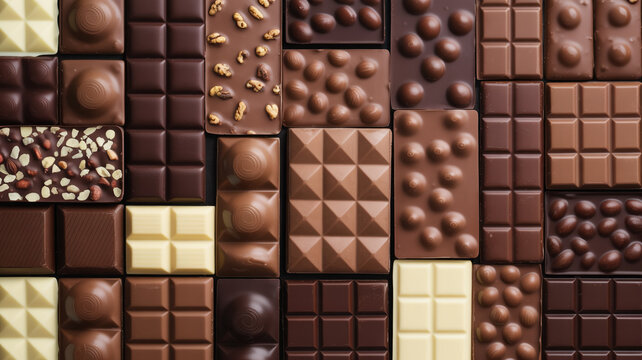 Delicious assortment of milk, dark, and white chocolate bars in a pattern