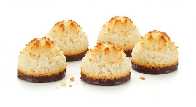 toasted coconut macaroons with chocolate base arranged on a white surface isolated on a plain background for dessert and bakery photography