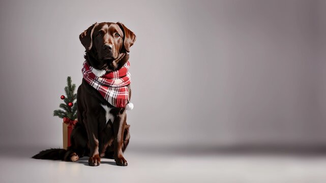 Adorable Christmas portrait: brown Labrador Retriever wearing Christmas scarf, isolated on a flat background with space for text