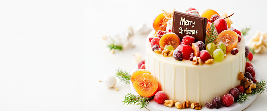 Festive Christmas Cake Decorated with Fresh Fruits, Nuts, and Chocolate Plaque on white background, banner