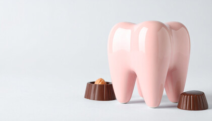 Tooth model and chocolate candy. Sugar and dental care, hygiene, stomatology concept.
