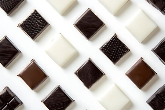 A precise geometric pattern of white and dark chocolate squares tessellated across a white background.