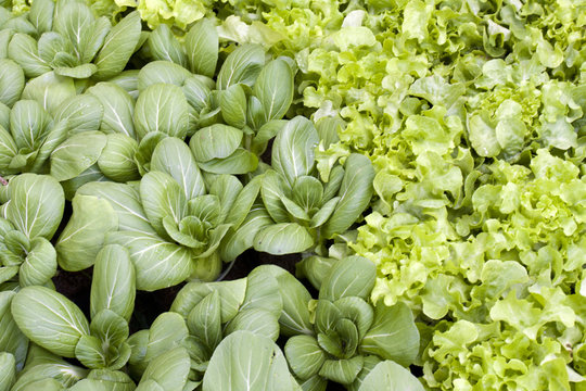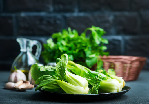 Fresh and raw Chinese cabbage pak choi and other green vegetables on vintage background.