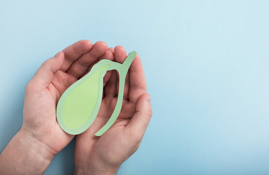 Man holding gallbladder decorative model on pastel blue background. Gallbladder disease concept, cholecystitis or biliary dyskinesia. Top view, copy space