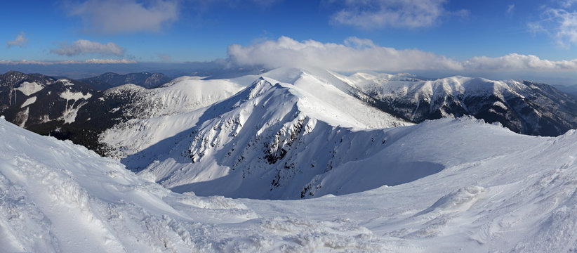 View on Vajskovska and Jasenianska valley from Chopok mountain in Low Tatras, Slovakia. Fairy-tale landscape with many snowy hills and sky with many shadows of blue. Paradise same as in Alps