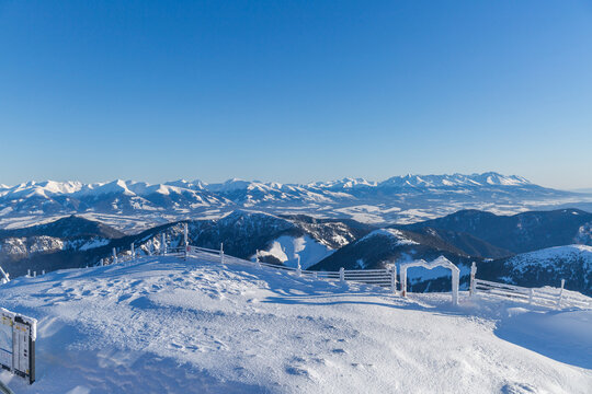 Wide panoramic view of snow-covered peaks in the Low Tatras National Park, Slovakia, featuring a bright sun star, frozen mountain ridges, and a distant view of the High Tatras under a clear winter sky