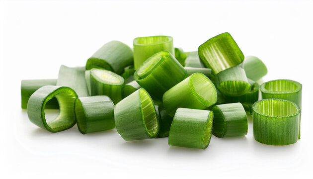 A scattering of finely diced green onions, varying in size and shade of green, is displayed against a stark white backdrop.