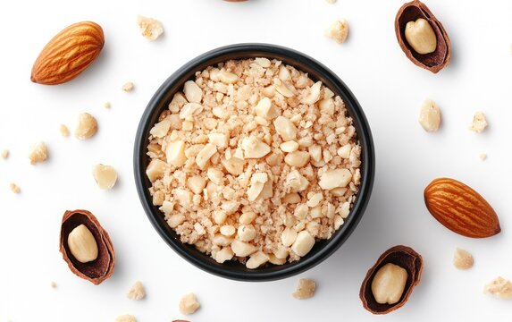 Pile chopped and roasted hazelnut isolated on white